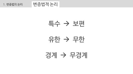 먼저 하나의 경계가 성립하면, 그 경계 안의 규정이 경계 바깥의 부정으로 바뀌고, 또 이것이 무한을 의미하게 되고, 이로써 그 경계는 소멸하지만 새로운 경계가 등장하게 된다는 것이 변증법적 사유의 핵심입니다.