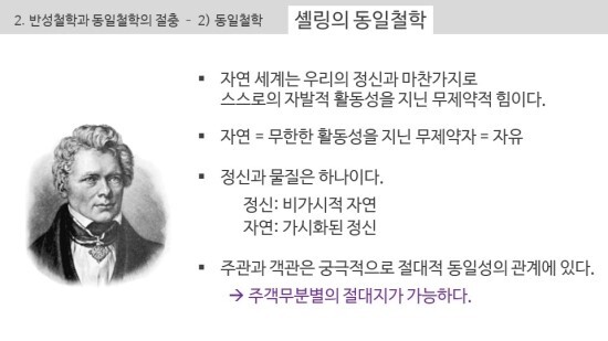 이러한 의미에서 정신과 물질은 하나가 됩니다. 정신은 비가시적 자연이고, 자연은 가시화된 정신입니다. 철학적 반성이 시작되면서 우리는 인식과 존재를 갈라놓게 되지만, 마찬가지로 철학을 통해 다시 주객을 일치시키는 것이 가능하다는 것이죠. 따라서 셸링의 철학을 동일철학이라고 부르게 됩니다.