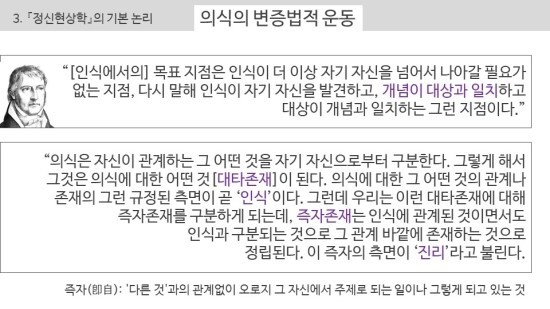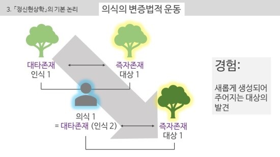 따라서 정신현상학에서 헤겔은 하나의 대상을 놓고 의식의 인식방식을 변경하는 게 아니라, 의식에 따라 새롭게 주어지는 대상과 그 대상에 대한 경험을 변증법적 운동과정으로 밝히고 있는 것입니다.