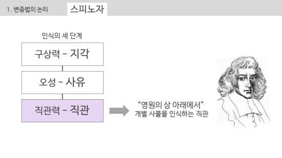 스피노자는 인식을 이렇게 세 단계로 나누었습니다. 구상력에 의한 지각, 오성에 의한 개념적 사유, 직관능력에 의한 직관.