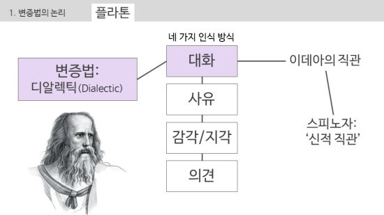 대화를 통해 얻어지는 이데아의 직관은, 그것이 궁극 근원과 시초에 관한 인식이라는 점, 그리고 일체 현상세계를 전체적 관점 내지 이데아적 영원의 관점에서 보게 되는 인식이라는 점에서 스피노자가 말한 ‘신적 직관’에 해당합니다.