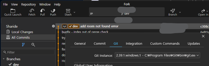 밝혀진 원인: 내가 받았던 Git 설치파일이 있었는데, 그 설치파일 자체가 문제였던 것 같다. 윈도우 초기화 하고, 파티션 쪼개고, 별 짓을 다 했는데 원인이 허무하다. Corrupted된 설치파일을 Git 홈페이지 가서 최신 버전 다운 받고, Fork에서 git instance 직접 지정하니까 해결되었다.